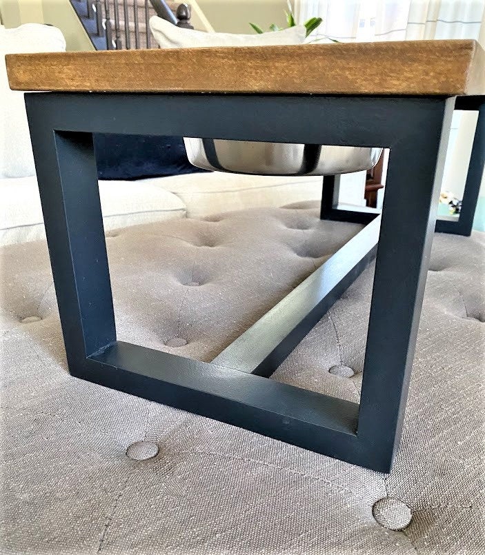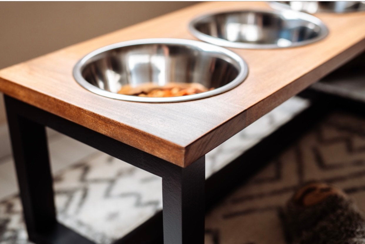 Expertly crafted, this Mid century modern dog bowl stand helps keep their tasty dinner and cool water within easy reach. Ideal for large breed dogs, this large elevated dog bowl stand features three stainless steel bowls and will be customized with your choice of colors for the top and base. Shown with Oak Stain Top and Night Base Color.